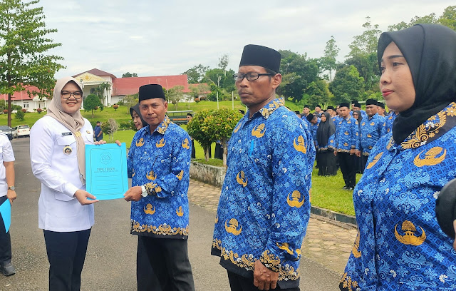 Bupati Tanjabtim, Hj. Dillah Hikmah Sari, ST menyerahkan Surat Keputusan (SK) pengangkatan 427 CPNS dan PPPK, di lapangan Kantor Bupati Tanjabtim, Rabu (23/4) kemarin.